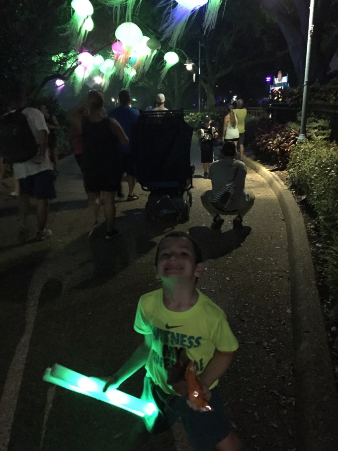 This 8:30 p.m. show was a hyped version of the day show with music and dancing while you wait for the show to start. The whales do the same basic moves splashing the audience and various other tricks. It’s unfortunate that rules do not allow trainers to enter the water because the shows seems repetitive. The kids enjoyed the music portions and danced with their light sticks.
